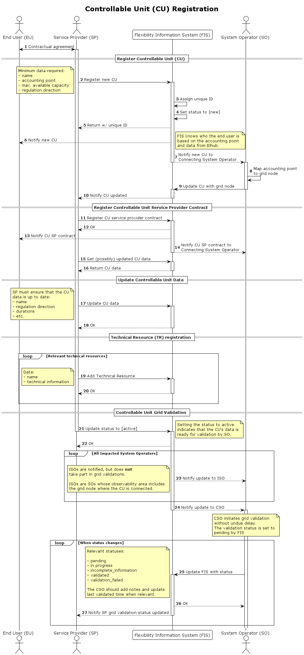 This process describes the registration of a controllable unit (CU) in the flexibility register as a Service Provider. It also includes grid validation for the system operator to validate the information provided.