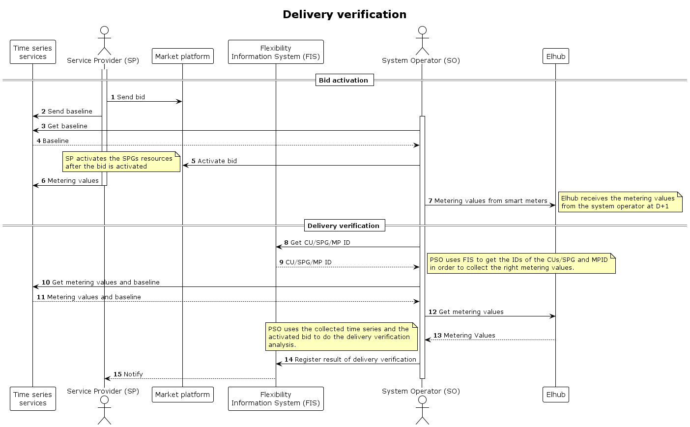 The delivery verification is done by the procuring system operator (PSO) that has activated a bid from the service provider (SP). The verification is done at the SPG level, as the service is delivered at the SPG level. Time series for the verification are available through the time series services and FIS.